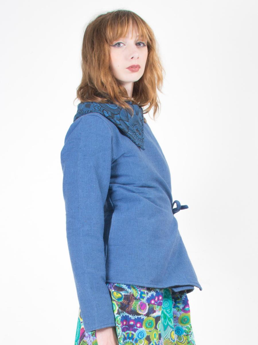 C'est une veste ethnique courte bleue au col original asymétrique.